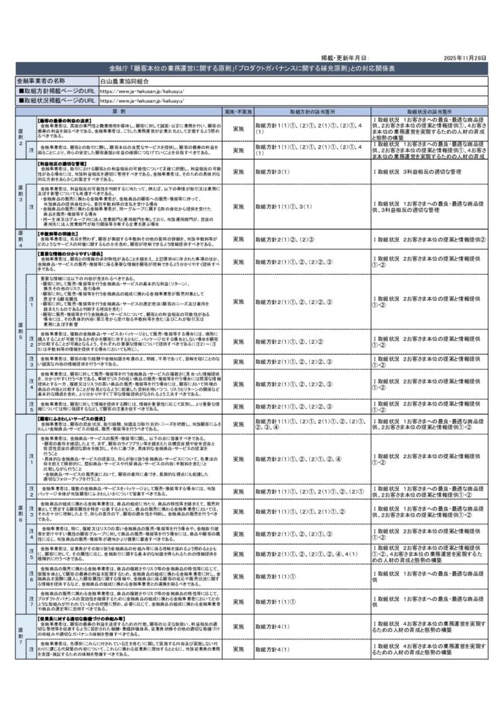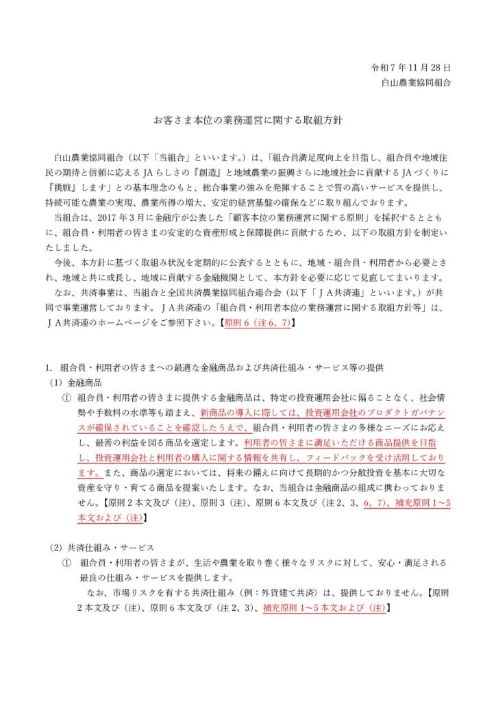 組合員・利用者本位の業務運営に関する取組方針 [更新日]2025/11/28 組合員・利用者本位の業務運営に関する取組方針 (クリックすると別のページへ移動します) PDFデータをご覧いただくには、Adobe Reader (無料)のダウンロードが必要です。最新版をダウンロードしてください