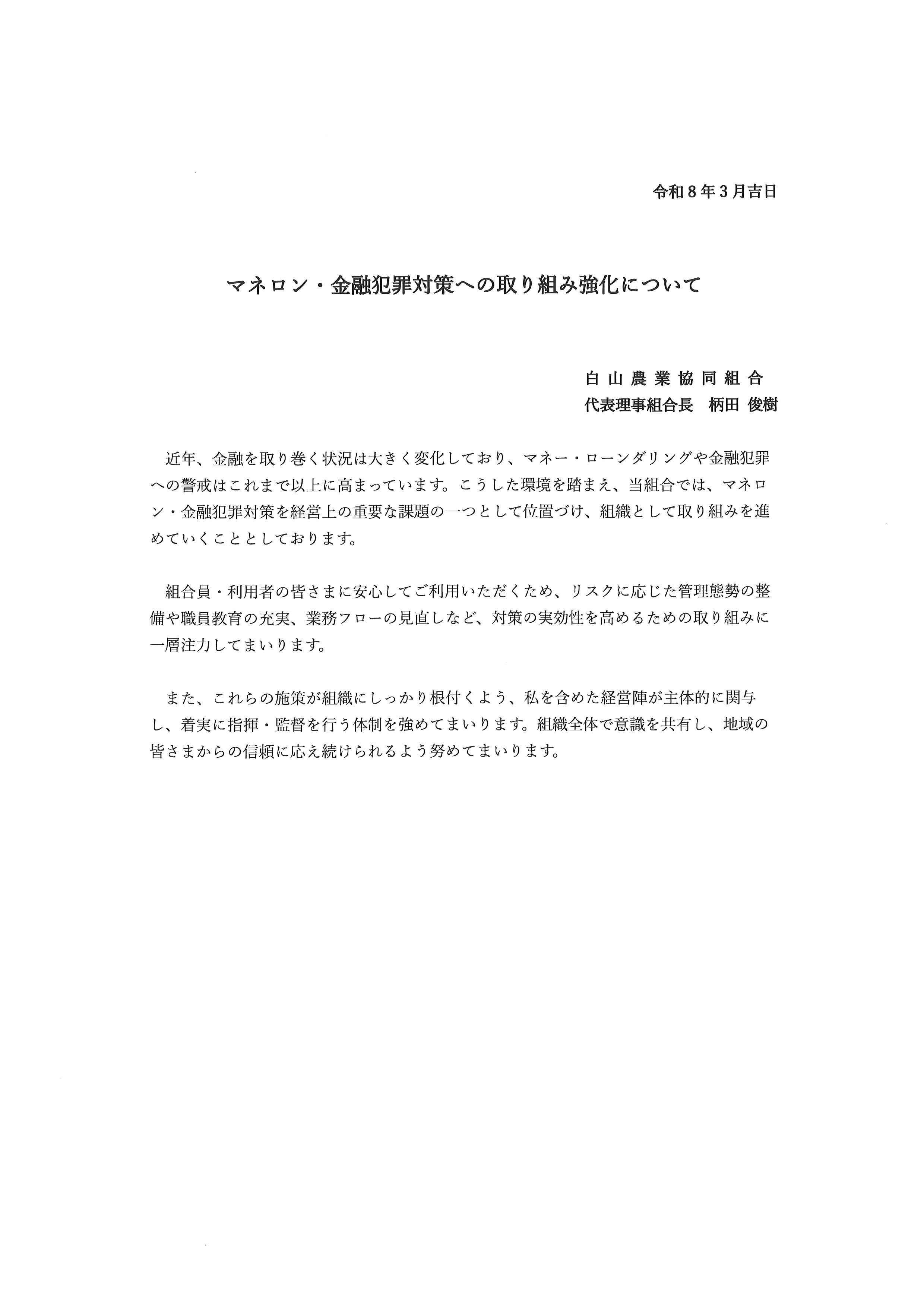 当JAでは、マネロン・金融犯罪対策を経営上の重要な課題の一つと位置付けており、下記の通り対応する事といたしました。
