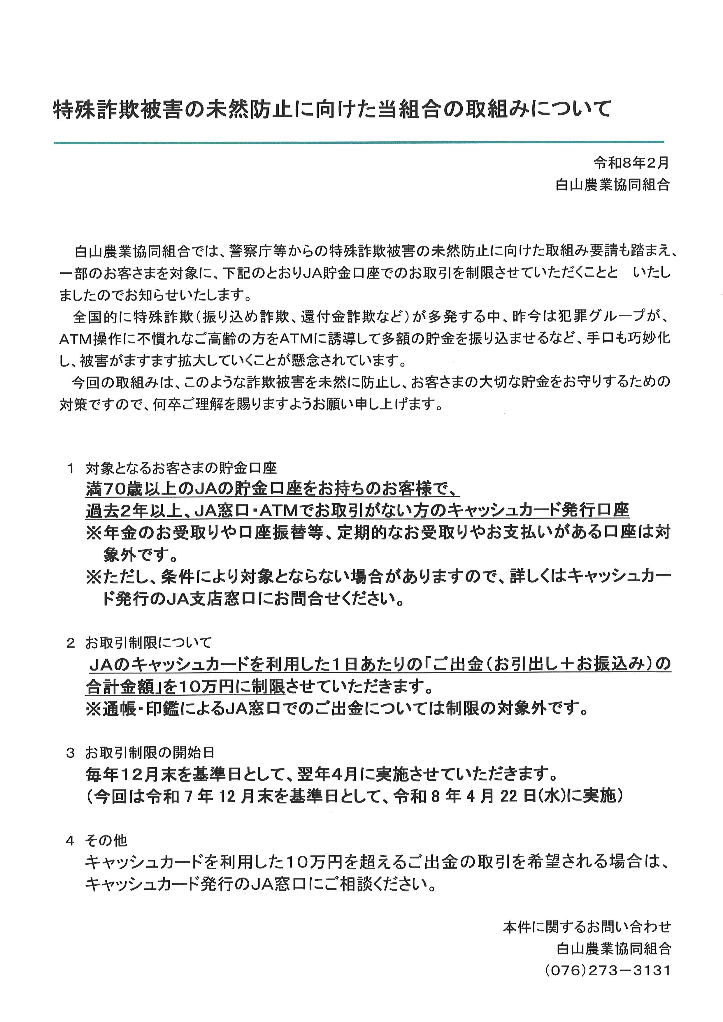特殊詐欺被害の未然防止に向けた当農協の取組みについて [公開日]2026/02/25 平素はJAの各事業につきまして格別のご高配を賜り、厚くお礼申し上げます。 当農協では、警察庁等からの特殊詐欺被害の未然防止に向けた取組み要請も踏まえ、一部のお客様を対象に、下記の通り、JA貯金口座でのお取引を制限させていただくことといたしました。 何卒宜しくお願い致します。