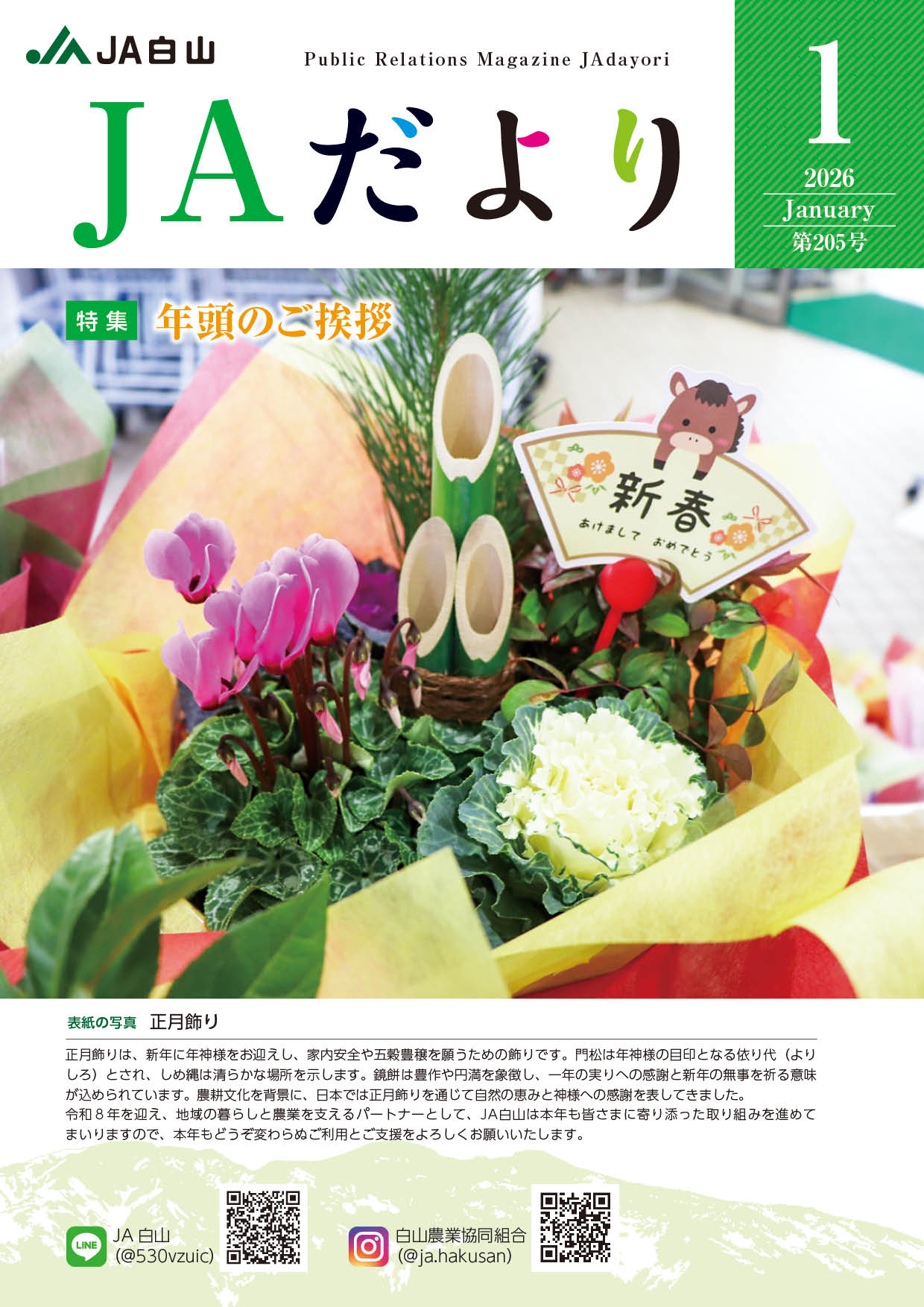 JAだより1月号掲載しました [更新日]2026/01/16 白山農業協同組合の広報誌「JAだより」です。 2026(令和8)年1月号 2025(令和7)年12月号 2025(令和7)年11月号 2025(令和7)年10月号 2025(令和7)年9月号 2025(令和7)年8月号 2025(令和7)年7月号 2025(令和7)年6月号 2025(令和7)年5月号 2025(令和7)年4月号 2025(令和7)年3月号 2025(令和7)年2月号 2025(令和7)年1月号 PDFデータをご覧いただくには、Adobe Reader (無料)のダウンロードが必要です。 最新版をダウンロードしてください JAだより バックナンバー 2024年(令和6年) 2023年(令和5年) 2022年(令和4年) 2021年(令和3年) 2020年(令和2年) 2019年(平成31年・令和元年) 2018年(平成30年) 2017年(平成29年) 2016年(平成28年)